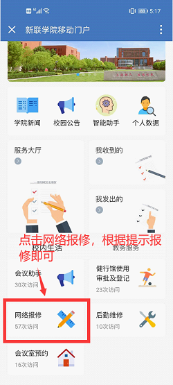 请使用手机打开企业微信→工作台→一站式服务大厅→网络报修,描述故障设备,报修地点提交报修(如下图)。