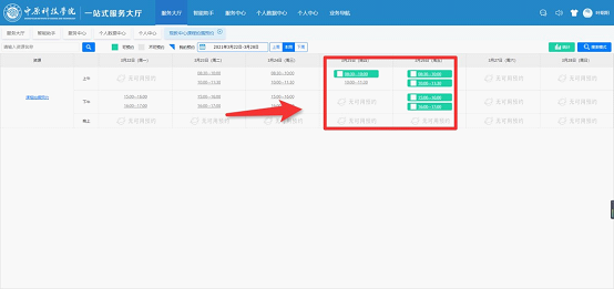 (3)绿色时间段是可预约时间段,选择您可预约的时间进行预约。(预约起止时间范围:提前一周可开始预约,提前一天停止预约)