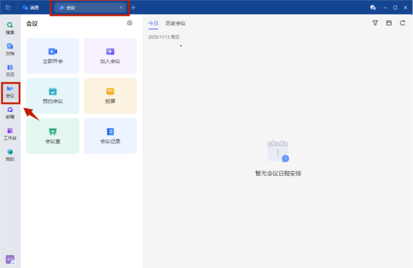 1.登录WPS协作,选择中原科技学院账号登录,选择左侧菜单栏【会议】应用即可进入会议功能界面。系统支持200人以下会议,超过200人会议请使用企业微信直播。